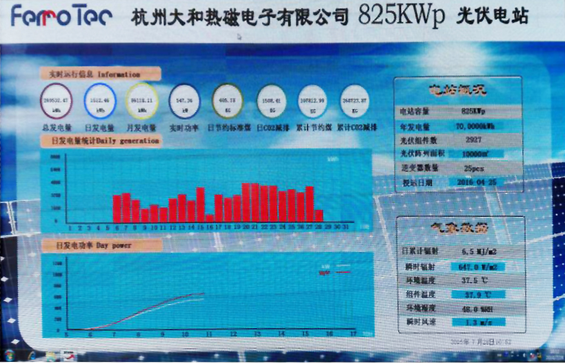 盡管近3個(gè)月天公不作美,陰雨天氣較多,嚴重影響到大和屋頂3萬(wàn)平方米(二廠(chǎng)加晶鑫屋頂)的光伏電站系統效能發(fā)揮,但累計到7月12日,該系統總計發(fā)電量已達630000多度, 因此而節省了大量的不可再生能源,減少了大氣污染。所發(fā)電力通過(guò)標準換算,總計節約標準煤約258000KG,降低二氧化碳排放量640多噸。