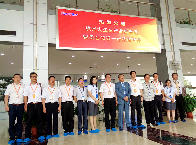 2017年8月15日下午在杭州大江東產(chǎn)業(yè)集聚區黨工委常務(wù)副書(shū)記、管委會(huì )常務(wù)副主任詹國平以及副主任許昌帶領(lǐng)集聚區經(jīng)發(fā)局、財政局、國土分局,投資合作局、招商中心主任等一行12人訪(fǎng)問(wèn)上海申和,此行的主要目的是商談今后大江東與Ferrotec中國在大硅片項目上的合作。