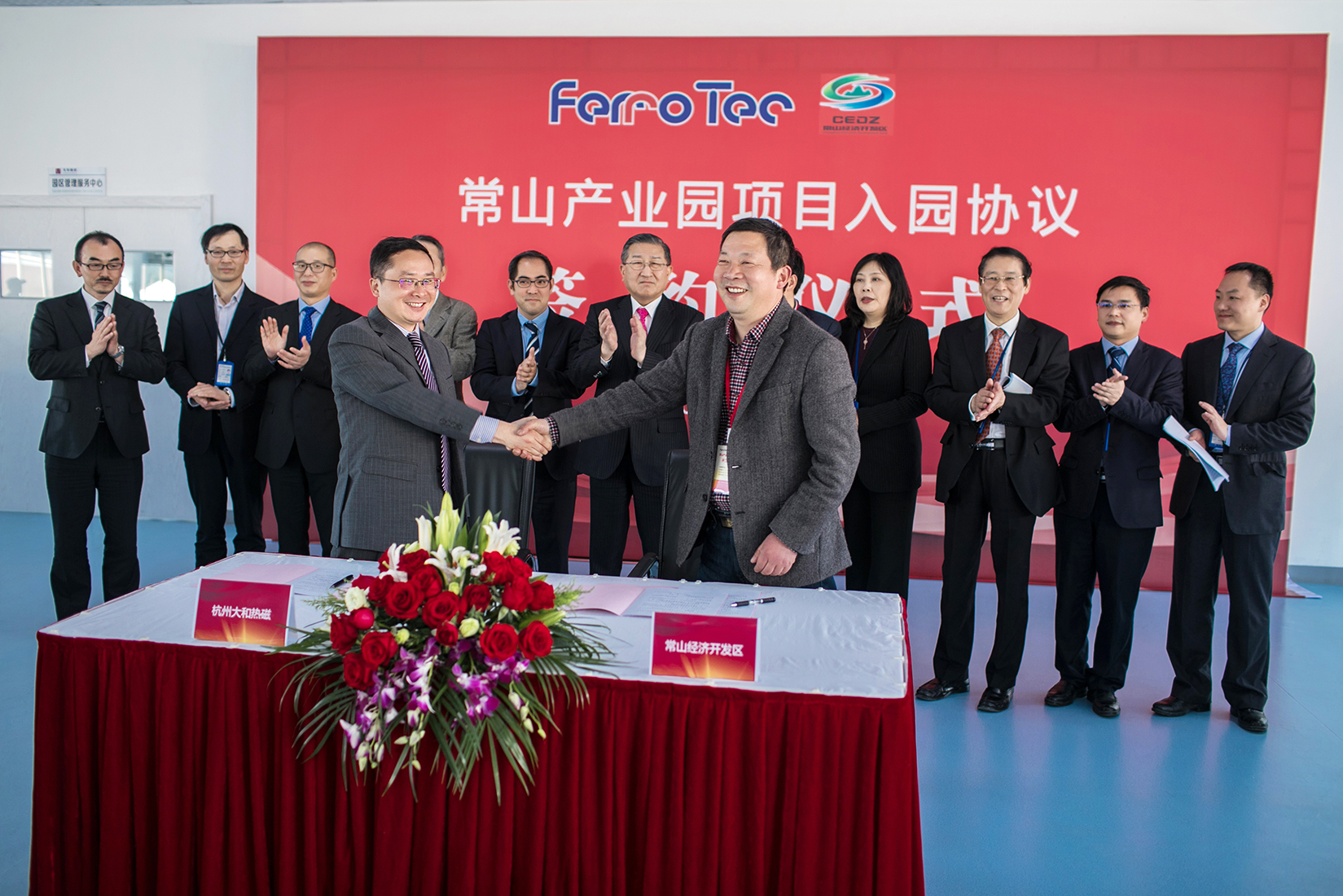 2018年2月28日15:58分,FERRTEC常山產(chǎn)業(yè)園項目開(kāi)工典禮暨《入園協(xié)議》簽約儀式在常山隆重舉行。常山縣縣委副書(shū)記、縣人民政府縣長(cháng)周向軍,縣委常委、縣政府黨組成員、開(kāi)發(fā)區黨工委書(shū)記姜蘇州,浙江中成建設工程有限公司副總經(jīng)理劉艷華等嘉賓以及日本總社代表取締役副社長(cháng)山村丈、代表取締役副社長(cháng)/FERROTEC中國總裁賀賢漢、取締役新居清彥、企畫(huà)室室長(cháng)內田浩介、FTH常務(wù)副總裁包有為、FTH副總裁董小平等公司領(lǐng)導出席了項目開(kāi)工儀式并為項目奠基。開(kāi)工典禮前,常山縣經(jīng)濟開(kāi)發(fā)區管委會(huì )主任楊春柳、FTH常務(wù)副總裁包有為代表雙方簽署了項目《入園協(xié)議》。