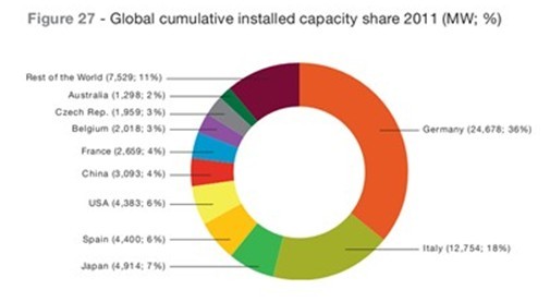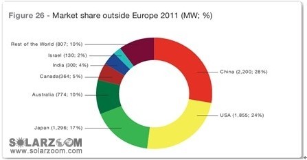 圖1:2011年歐洲以外的光伏裝機份額(MW;%)