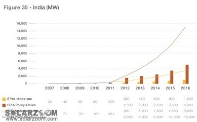 印度的國家太陽(yáng)能計劃(JJNSM)已在2010年1月啟動(dòng),目的是為了實(shí)現政府制定的到2022年22GW的發(fā)電目標(20GW并網(wǎng)系統,2GW的離網(wǎng)系統)。該項目啟動(dòng)緩慢,特別是并網(wǎng)系統,這種支離破碎的狀況主要是由地區政策所致。2011年印度大約安裝了300MW,使其累計裝機量達到520MW。若以印度國家規模來(lái)論,光伏市場(chǎng)在印度還沒(méi)有真正的形成,它看上去更像一個(gè)附屬項目。印度國家太陽(yáng)能計劃打算到2013年實(shí)現并網(wǎng)發(fā)電1GW到2GW的目標,第二個(gè)階段到2017年達到4GW到10GW的發(fā)電規模,最后到2022年達到20GW。
