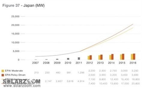 早在光伏技術(shù)未成熟前,日本就開(kāi)始發(fā)展光伏發(fā)電。多年來(lái)日本光伏市場(chǎng)發(fā)展迅速,2010年安裝了990MW的光伏發(fā)電系統。2011年3月的福島核災難讓日本重新調整能源戰略。盡管存在一些不利條件,2011年日本的光伏安裝已達到1296MW,且有望迎來(lái)更大的發(fā)展。官方目標是在2020年達到28GW,而且真正的市場(chǎng)規模有可能會(huì )更高。到2030年,日本政府計劃40%的國家電力需求將來(lái)自可再生能源,其中光伏應該至少占53GW。同時(shí),該國當局估計日本真正的光伏潛力大約為230GW。