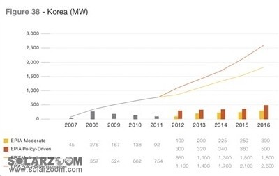 曾幾何時(shí)韓國位列十大光伏裝機市場(chǎng),但該國的光伏安裝量在2009年和2010年開(kāi)始下滑,2011年更是如此,僅僅安裝了92MW。由于政策的約束,盡管市場(chǎng)潛力很大,但在接下來(lái)的五年里韓國每年的裝機量可能會(huì )被限制在每年200MW-500MW。自2012年以來(lái),上網(wǎng)電價(jià)方案被可再生能源配額制度(RPS)代替,這一標準規定電力企業(yè)有義務(wù)生產(chǎn)一定數量的新能源電力,光伏發(fā)電自然也就占據了一定的份額。