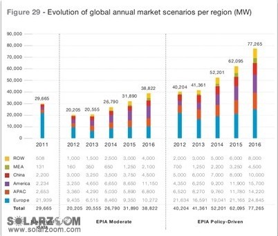 但對于產(chǎn)業(yè)鏈大多數環(huán)節來(lái)說(shuō),降低成本的空間變得越來(lái)越小。此外,具有較大發(fā)展潛力的現有市場(chǎng)是很有限的,因為越來(lái)越多的國家開(kāi)始實(shí)行注冊和總量控制。伴隨著(zhù)歐洲發(fā)展速度的放緩,進(jìn)一步快速的價(jià)格下降可能會(huì )導致世界各地的工廠(chǎng)關(guān)閉。這種狀況的改變主要依賴(lài)于歐洲市場(chǎng)的改變,以及決策者的能力,確保市場(chǎng)可以維持在一個(gè)可以接受的水平。在政策驅動(dòng)下,歐洲市場(chǎng)將在未來(lái)幾年內穩定在大約20GW-25GW的水平,同歐洲以外的市場(chǎng)一道進(jìn)行。照這樣發(fā)展,市場(chǎng)可能會(huì )在2016年超過(guò)75GW,其中三分之二是來(lái)自歐洲以外的新市場(chǎng)。新市場(chǎng)能夠確保2012年以及在接下來(lái)的幾年里全球光伏市場(chǎng)不斷增長(cháng)。