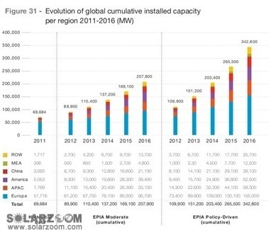 圖6:2011-2016年全球各地區光伏累計裝機計劃(MW)