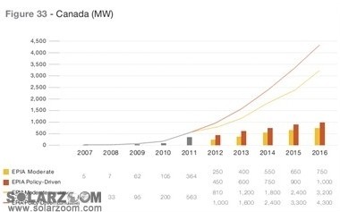 加拿大2011年的市場(chǎng)增長(cháng)了364MW,相比2010年戲劇性地增長(cháng)了340%。這種增長(cháng)主要是靠安大略省,該省依托優(yōu)厚的上網(wǎng)電價(jià),占澳大利亞總裝機容量的85%。安大略省2010年推出了一種針對地方供應商的條列,要求開(kāi)發(fā)商的項目至少有60%的產(chǎn)品來(lái)自當地。雖然在2012年初安大略省的上網(wǎng)電價(jià)水平有所下降,但一定數量的其他省份卻在逐步地發(fā)展光伏市場(chǎng),使得人們的關(guān)注焦點(diǎn)不僅僅是安大略省。在政策驅動(dòng)下,到2016年加拿大市場(chǎng)的累計安裝容量將達到4.2GW。
