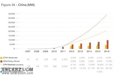 在省一級,其他項目已經(jīng)在2012年正式啟動(dòng),如由國家發(fā)展和改革委員會(huì )批準的鄂爾多斯2GW、280MW沙漠地區項目。在國家和地區級項目的推動(dòng)下,中國目前已經(jīng)正式成為一個(gè)大型GW級市場(chǎng)。中國已經(jīng)把5GW定位為2015年的最低光伏裝機目標,2020年長(cháng)期目標達到20-30GW,但事實(shí)上最新的規劃已經(jīng)大大超過(guò)了這一目標。2011年中國安裝了2200MW(1.8GW的大規模地面安裝項目和400MW的屋頂項目)的光伏系統,使得其累計裝機量為3093MW。有關(guān)當局目前預計2012年的市場(chǎng)將達到4GW-5GW,屆時(shí)中國將以難以置信的潛力在未來(lái)幾年內進(jìn)入全球前三強。估計中國市場(chǎng)的潛力,尤其是在目前的低價(jià)格水平下,在未來(lái)五年內一片大好??傃b機容量在2016年可能超過(guò)35GW,到時(shí)候年度市場(chǎng)可達10GW。