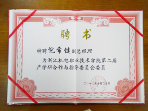 最佳校企合作企業(yè)證 倪希健聘為浙江機電學(xué)院第二屆產(chǎn)學(xué)研合作與指導委員會(huì )委員