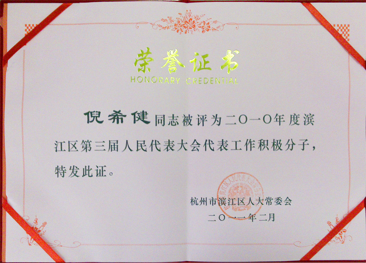為此,倪希健被評為2010年度濱江區第三屆人大代表大會(huì )代表工作積極分子。