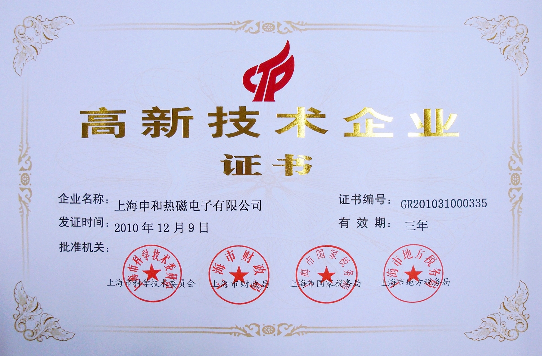 2010年12月份申和公司通過(guò)了上海市科委認定,取得了上海市高新技術(shù)企業(yè)證書(shū)。有效期為三年。高新技術(shù)企業(yè)證書(shū)作為企業(yè)無(wú)形資產(chǎn),在企業(yè)的生產(chǎn)經(jīng)營(yíng)中發(fā)揮著(zhù)巨大的作用。
