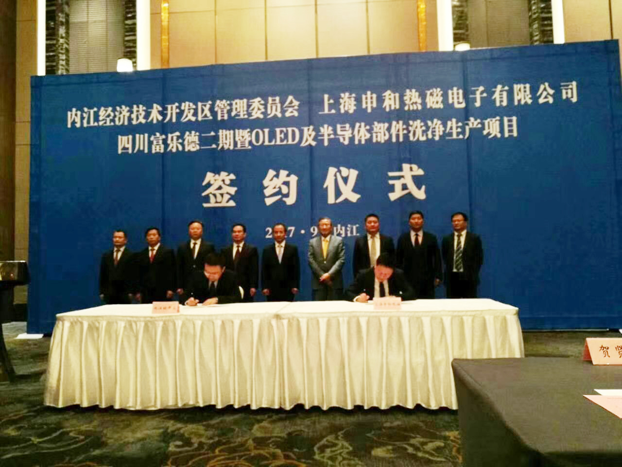2017年9月4日,內江經(jīng)濟技術(shù)開(kāi)發(fā)區管理委員會(huì )與上海申和熱磁電子有限公司簽署“四川富樂(lè )德二期暨OLED及半導體部件洗凈生產(chǎn)項目”合作協(xié)議。市委副書(shū)記、市長(cháng)任曉春,市委副書(shū)記牟錦毅會(huì )見(jiàn)Ferrotec集團中國區總載賀賢漢一行,并共同出席簽署儀式。