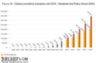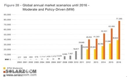 但對于產(chǎn)業(yè)鏈大多數環(huán)節來(lái)說(shuō),降低成本的空間變得越來(lái)越小。此外,具有較大發(fā)展潛力的現有市場(chǎng)是很有限的,因為越來(lái)越多的國家開(kāi)始實(shí)行注冊和總量控制。伴隨著(zhù)歐洲發(fā)展速度的放緩,進(jìn)一步快速的價(jià)格下降可能會(huì )導致世界各地的工廠(chǎng)關(guān)閉。這種狀況的改變主要依賴(lài)于歐洲市場(chǎng)的改變,以及決策者的能力,確保市場(chǎng)可以維持在一個(gè)可以接受的水平。在政策驅動(dòng)下,歐洲市場(chǎng)將在未來(lái)幾年內穩定在大約20GW-25GW的水平,同歐洲以外的市場(chǎng)一道進(jìn)行。照這樣發(fā)展,市場(chǎng)可能會(huì )在2016年超過(guò)75GW,其中三分之二是來(lái)自歐洲以外的新市場(chǎng)。新市場(chǎng)能夠確保2012年以及在接下來(lái)的幾年里全球光伏市場(chǎng)不斷增長(cháng)。