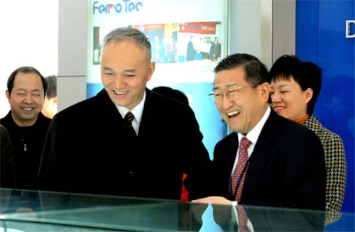 12月7日上午杭州市政府蔡奇市長(cháng)、佟桂莉副市長(cháng)在杭州高新區(濱江)張耕區長(cháng)等領(lǐng)導陪同下,前來(lái)杭州大和熱磁電子有限公司視察調研。杭州大和熱磁電子有限公司賀賢漢總經(jīng)理及戴明常務(wù)副總、董小平副總、倪希健副總等高層領(lǐng)導在濱江二工廠(chǎng)熱情接待蔡奇市長(cháng)一行。賀總首先在接待大廳向蔡奇市長(cháng)介紹本企業(yè)產(chǎn)業(yè)結構及經(jīng)營(yíng)狀況,并就FerrroTec(中國)明年在太陽(yáng)能光伏產(chǎn)業(yè)的發(fā)展規劃向蔡奇市長(cháng)進(jìn)行詳細匯報。同時(shí)也提出本公司在產(chǎn)業(yè)經(jīng)營(yíng)發(fā)展中目前存在的困難和瓶頸。蔡奇市長(cháng)對大和公司在太陽(yáng)能光伏產(chǎn)業(yè)的發(fā)展規劃非常感興趣,并在賀總陪同下興致勃勃參觀(guān)杭州先進(jìn)石英材料有限公司坩堝生產(chǎn)現場(chǎng)及真空事業(yè)部單晶爐、多晶爐裝備制造現場(chǎng)。參觀(guān)期間蔡奇市長(cháng)叮囑張耕區長(cháng),高新區要在高新技術(shù)產(chǎn)業(yè)上下功夫,在“兩新兩強兩優(yōu)”基礎上大力發(fā)展新興產(chǎn)業(yè)。要通過(guò)人才和資本銜接,促進(jìn)創(chuàng )業(yè)創(chuàng )新,要大力實(shí)施5050人才計劃,降低商務(wù)成本留住人才。在杭州大和熱磁電子有公司等高新企業(yè)快速發(fā)展同時(shí),區政府要在土地、人才資源及政策方面給予全力支持。同時(shí)也要求企業(yè)勇當科技創(chuàng )新排頭兵,為推動(dòng)高新技術(shù)產(chǎn)業(yè)發(fā)展,構筑“天堂硅谷”,建設科技新城作貢獻。
